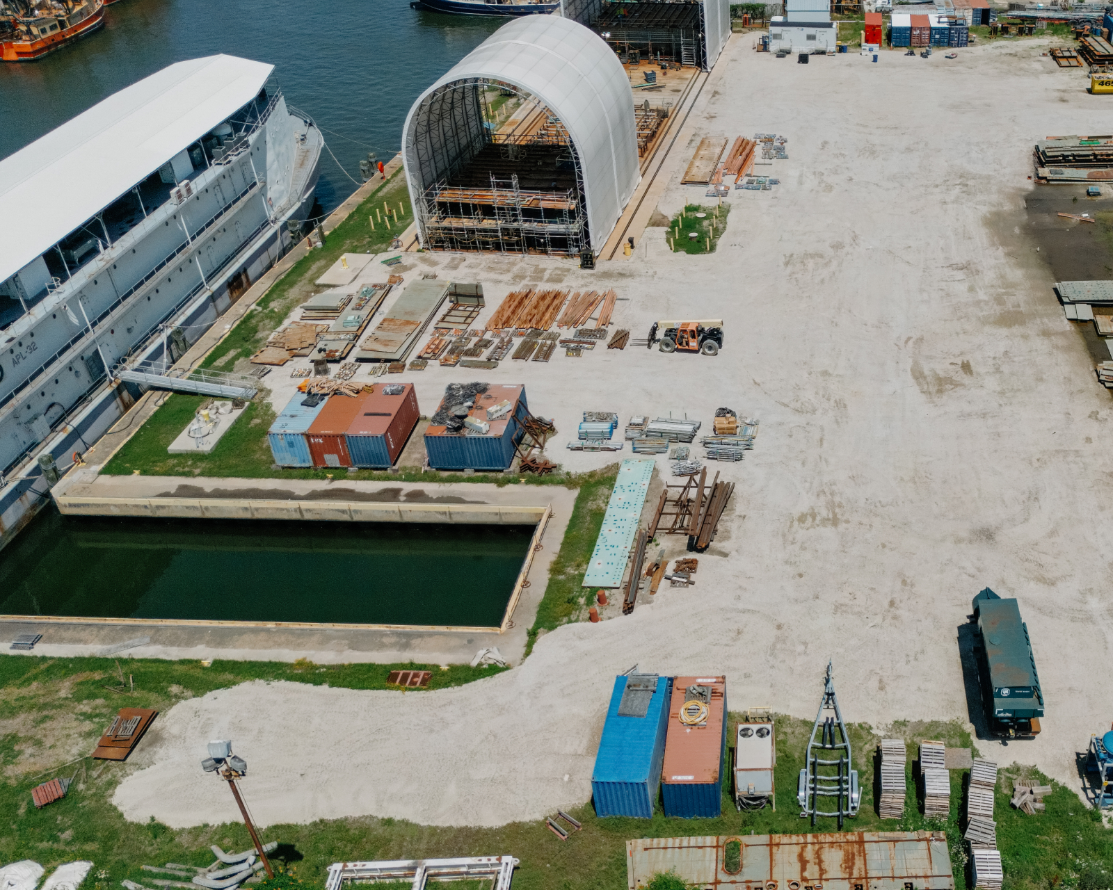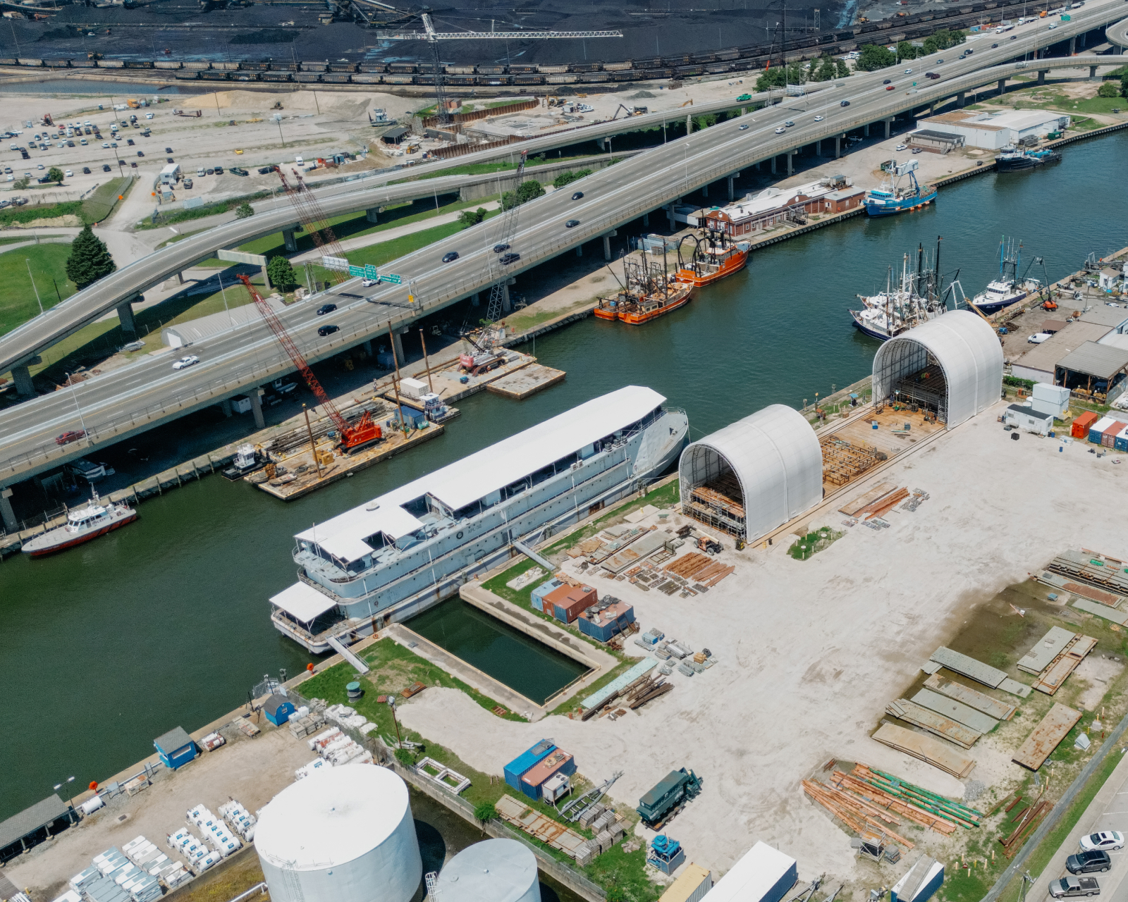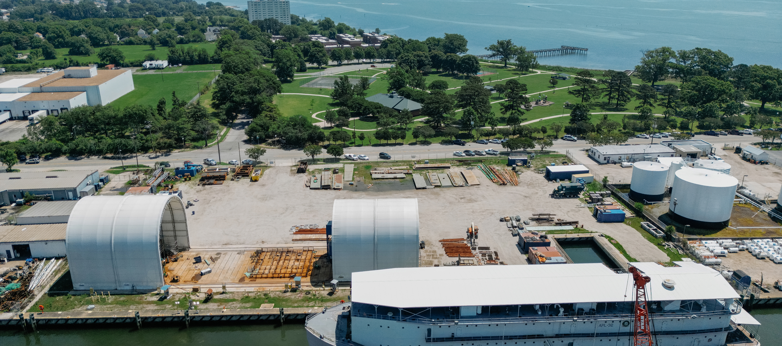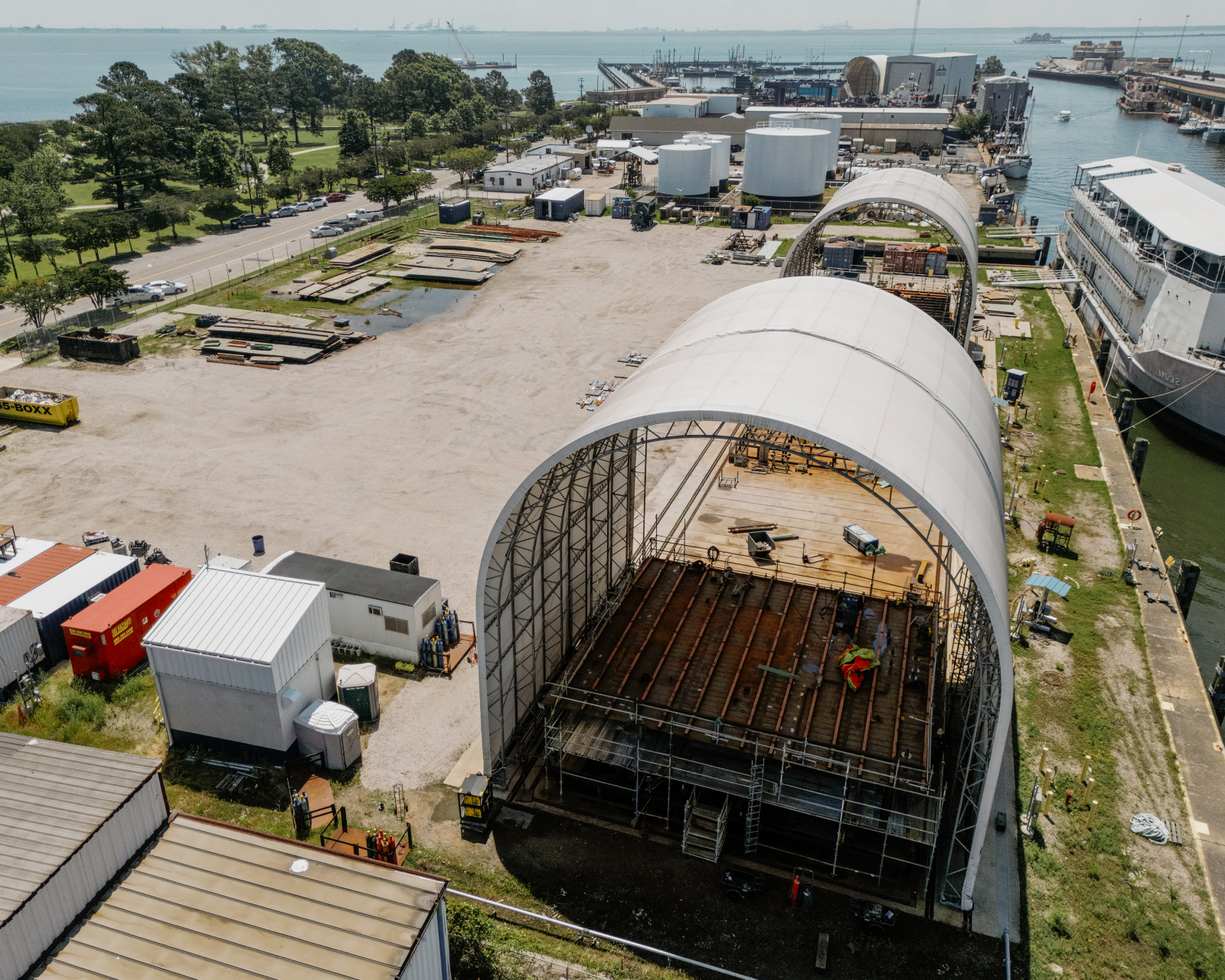 Located just 1.5 miles from Newport News Shipbuilding, Jefferson Avenue supports large-scale ship and boat repair, heavy fabrication, and modular work. With a 500-ton lift capacity, expansive covered platen space, and 10 acres of waterfront access, the site is purpose-built for handling oversized structures, jigs, and fixtures with direct water access.